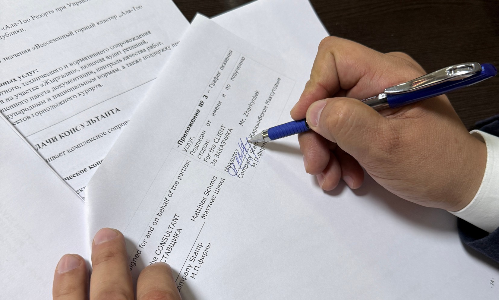 Директор «Ала-Тоо Резорта» Жаркынбек Максутов и Маттиас Шмид — директор компании SkiMIS, обладающий более чем 20-летним опытом управления и эксплуатации ведущих горнолыжных курортов в Альпах, Скандинавии, Новой Зеландии и Восточной Европе, подписали соглашение о предоставлении консалтинговых услуг для проекта горнолыжного курорта.